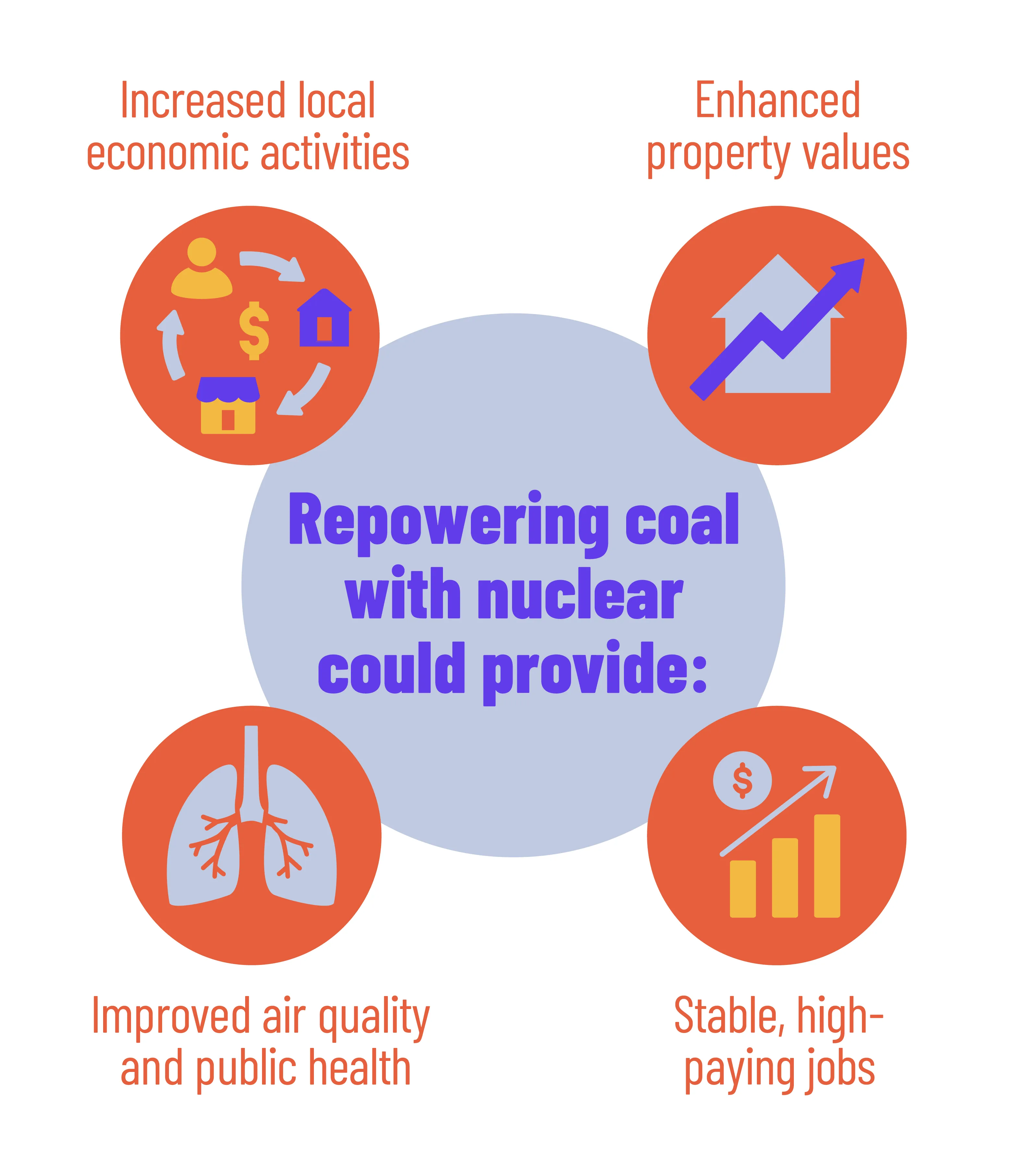 Repowering coal with nuclear could benefit communities and project developers alike, bringing in new jobs while supporting the local economy and decreasing utility costs. One DOE study33 found that replacing a 924 MW-electric coal plant with nuclear could increase regional economic activity by $275 million and add 650 new, high-paying, and stable jobs.34 One of the first demonstrations of advanced reactors will take place near a retiring coal plant in Kemmerer, Wyoming.35 TerraPower intends to begin construction on this reactor this decade.36 If the project goes ahead, the Natrium SMR will bring thousands of temporary construction jobs37 and hundreds of permanent, high-paying energy jobs38 to a community that has historically relied on the coal plant for jobs and revenue.