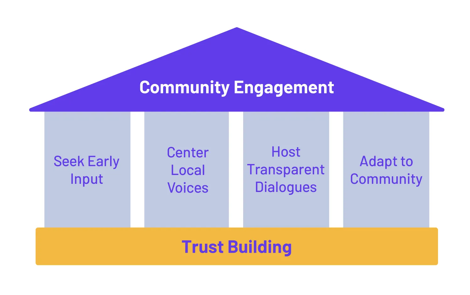While successful community engagement will look different in every community, several key pillars define an equitable local engagement process. These include seeking early input from community members, hosting open and transparent dialogues, elevating and centering local voices, and adapting to local contexts and values. Project developers and communities should also define mutually agreeable off-ramps for the community to back out of the reactor project without penalty if predetermined economic or attitudinal conditions change. Successful infrastructure projects often feature commitments to a community.27 For instance, a community may need more resources or technical expertise to engage meaningfully in a siting decision-making process. Creative funding mechanisms can enable a more participatory approach and empower communities to steer the project in a locally suitable direction.28