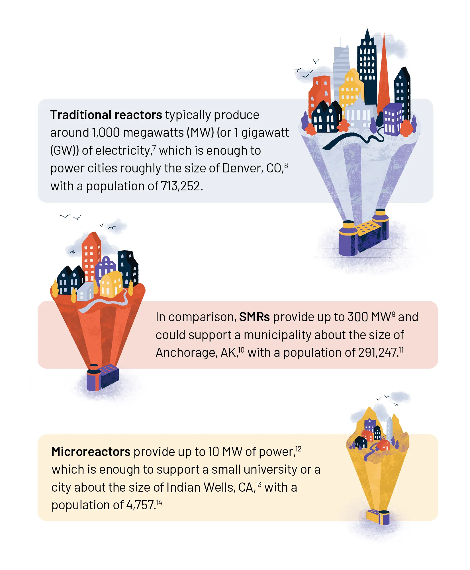 One of the virtues of advanced reactors is their size.6 Small modular reactors, or SMRs, are a category of advanced reactors smaller than today's operating nuclear plants. Some advanced reactors, called microreactors, are even smaller.